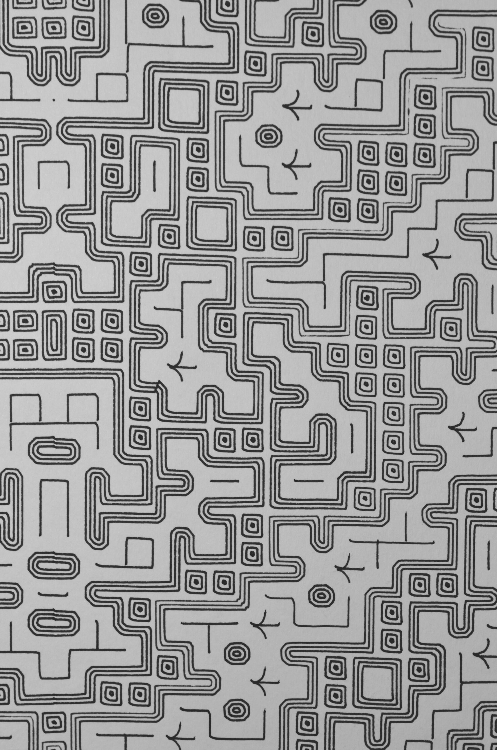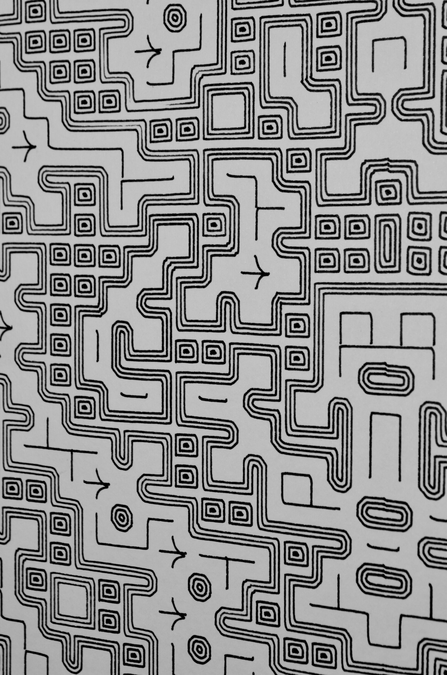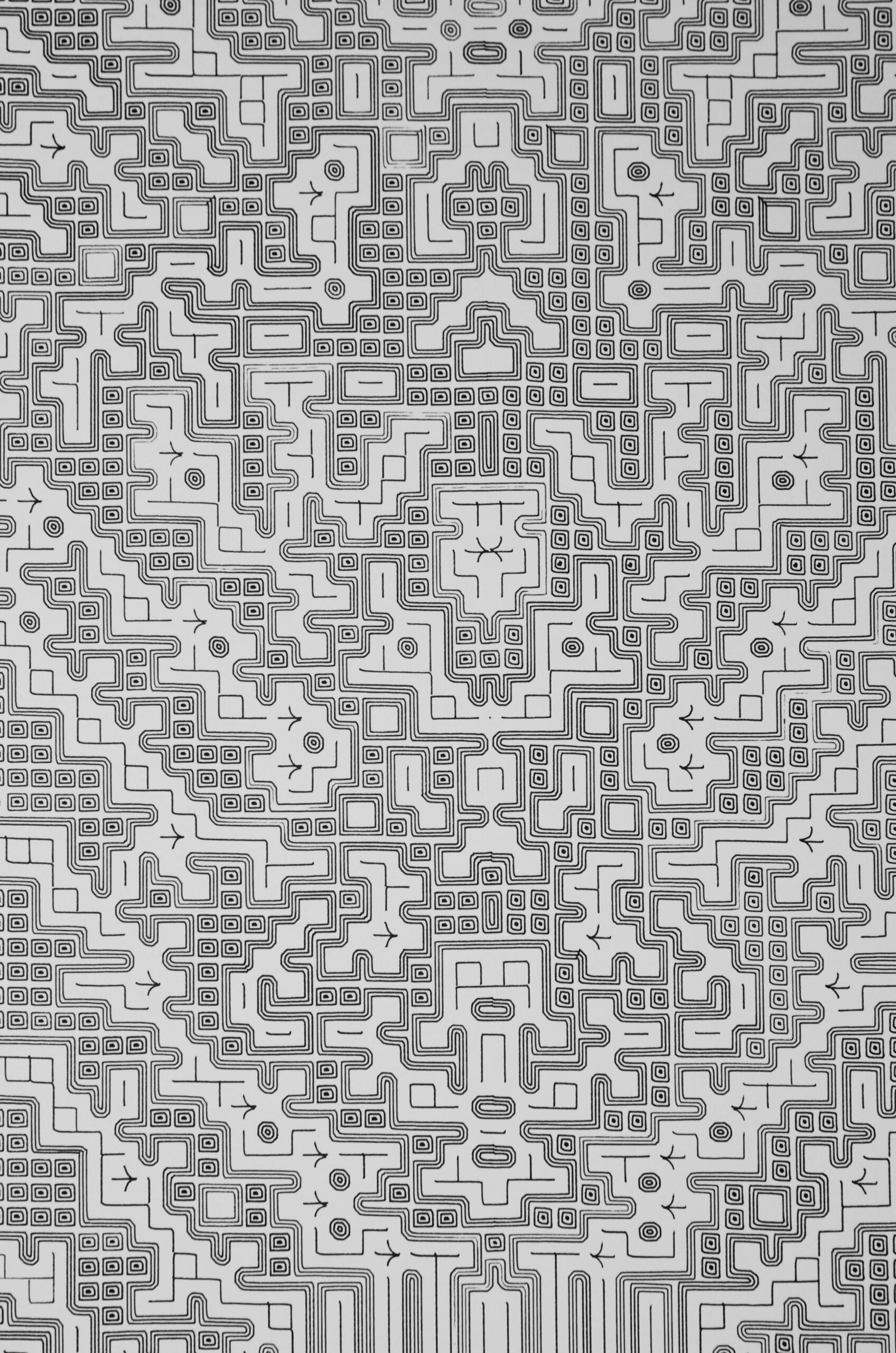 A través de un proceso iterativo, los estados de las células evolucionan, creando patrones emergentes de “vida” en forma de unos y ceros. En una segunda etapa, esta retícula cobra una nueva forma cuando un segundo algoritmo traduce estos patrones en complejos gráficos de grecas entrelazadas, inspirados en arquetipos prehispánicos.